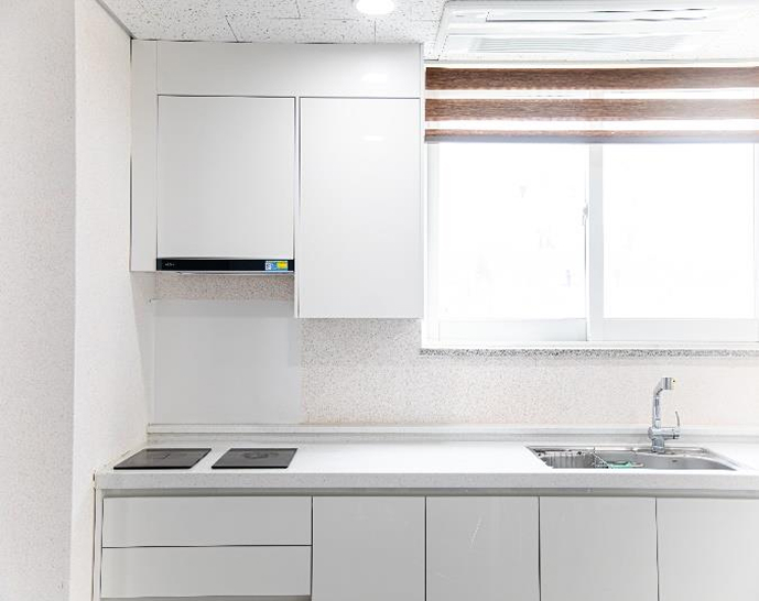 Kitchen utensils, cuttery, micro wave, electronic stove(2), water purifier(3F, 4F), sink, sponge, dishwashing liquid, table, chair